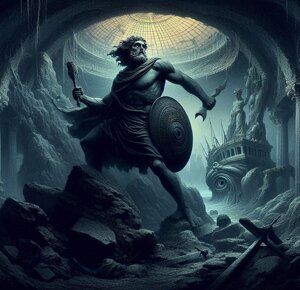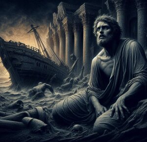 The voyage is completed for Odysseus and his companions with a shipwreck, caused by a vortex that originates from the sea when his ship arrives near a mountain.
